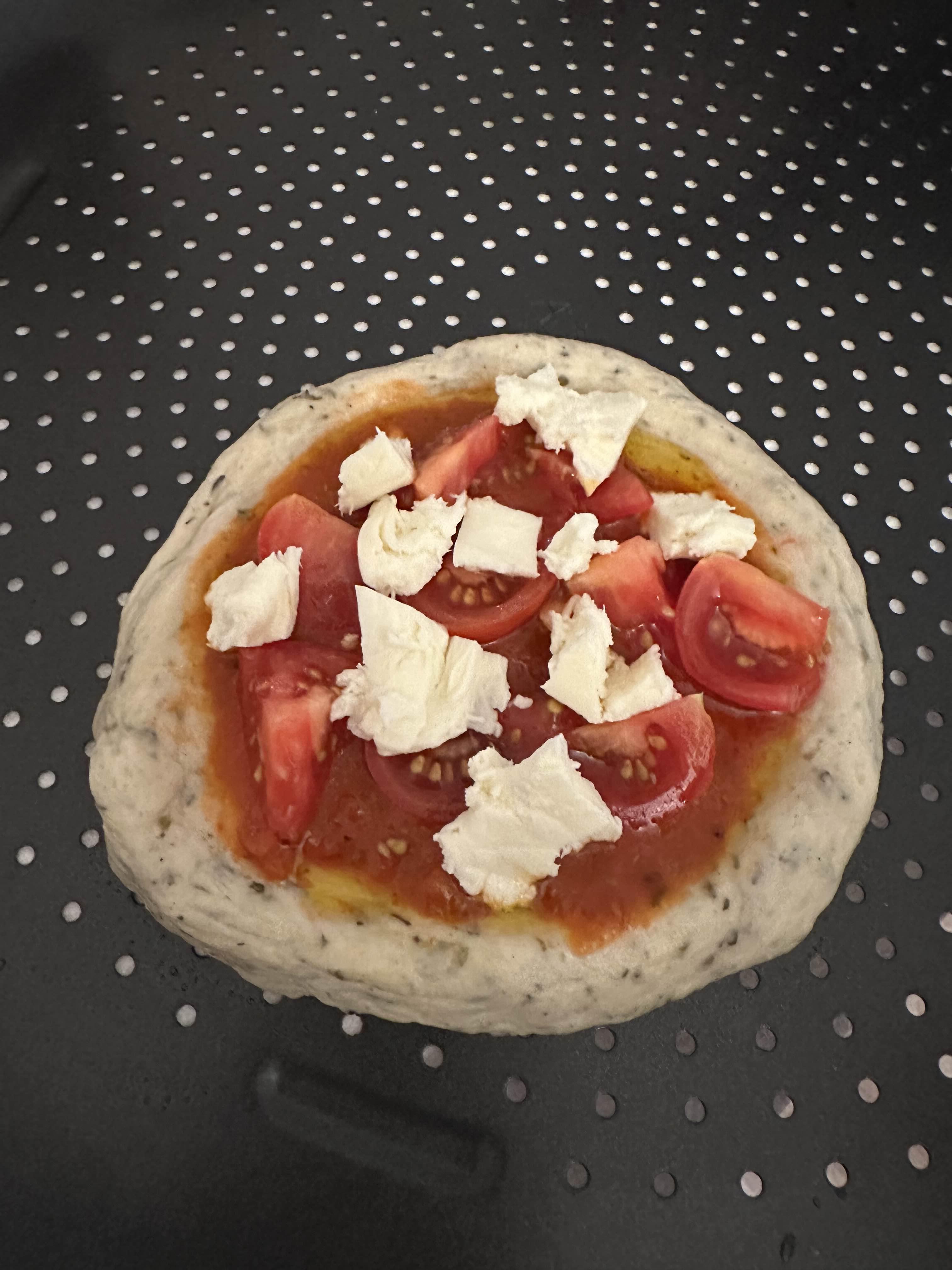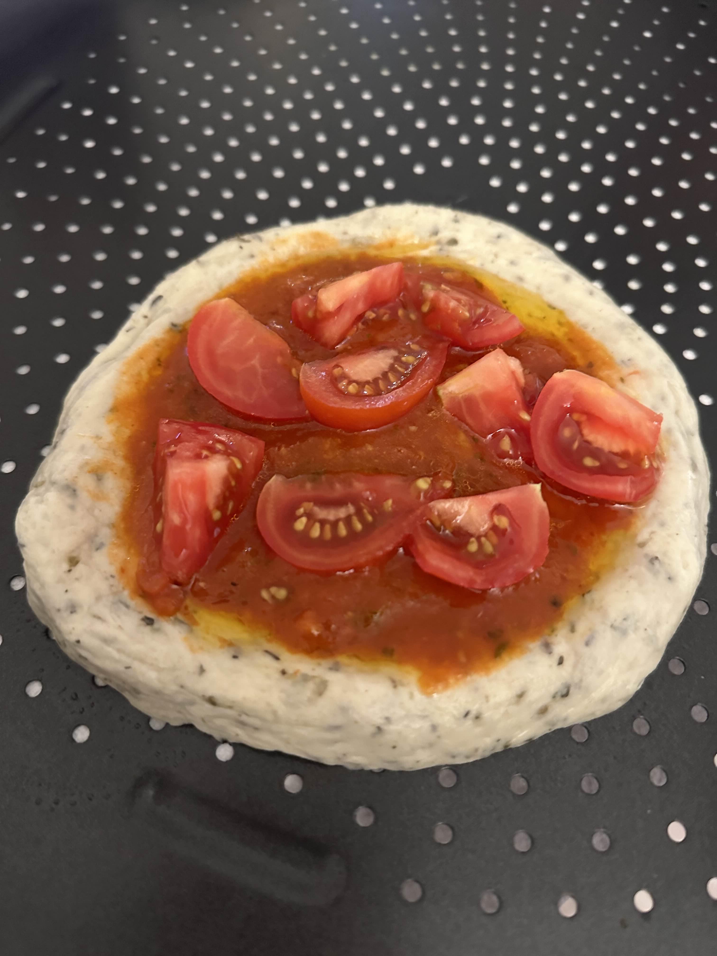 - 피자 도우, 마리나라 소스, 캄파리 토마토, 모차렐라 치즈, 바질, 올리브유
