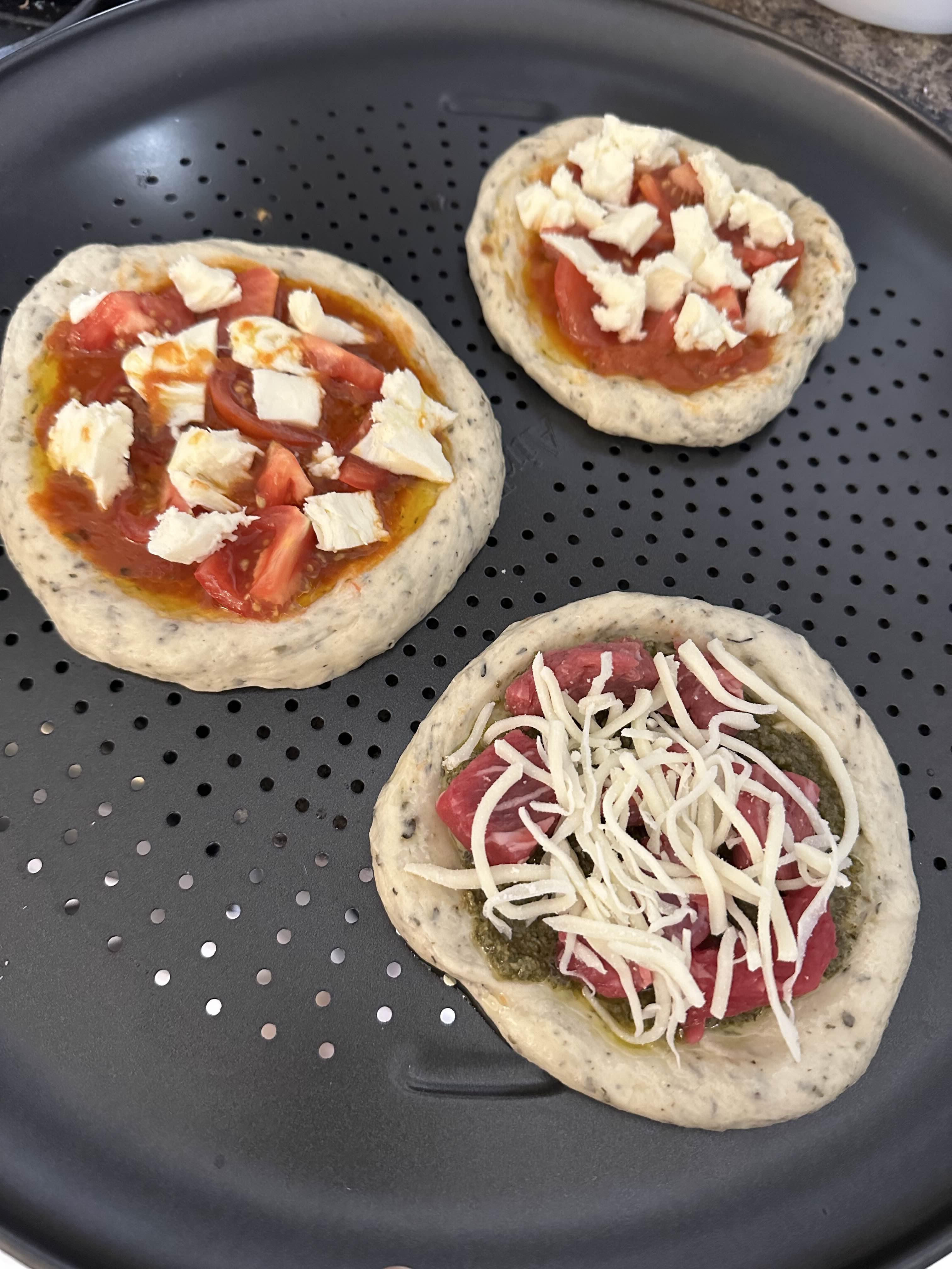 - 피자 도우, 소고기, 바질 페스토, 모짜렐라 치즈 (shredded)