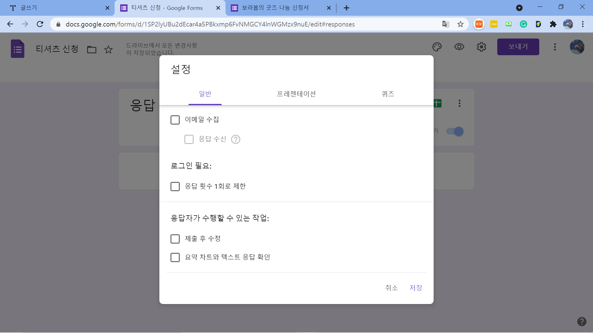 13. ‘설정’에서는 설문지 제출 시 ‘이메일 수집’을 하거나 ‘응답 횟수 제한’ 등 설문에 관련된 전반적인 설정을 할 수 있습니다.