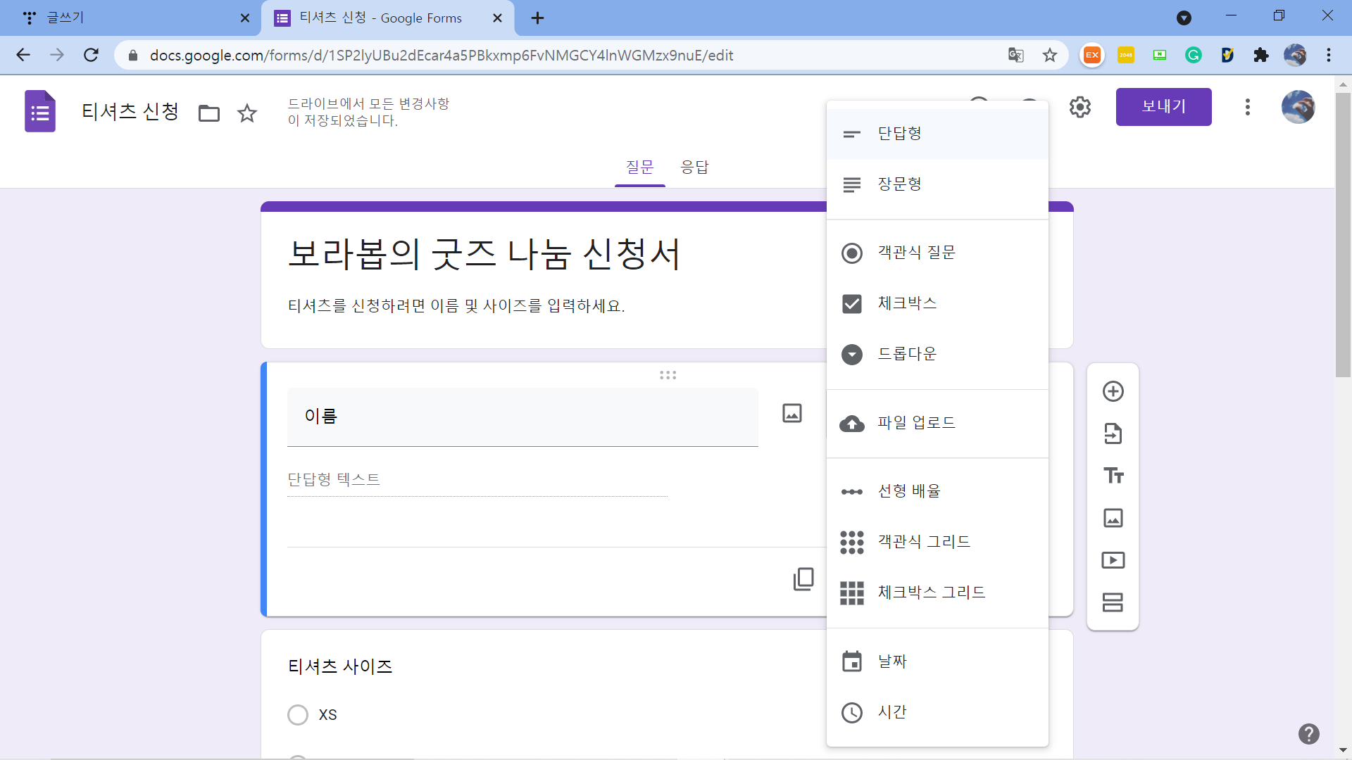 10. 티셔츠 사이즈는 ‘객관식 질문’으로 설정이 되어있습니다. 여러 가지 보기를 선택하게 할 경우에는 객관식 질문형으로 바꾸시면 좋아요!