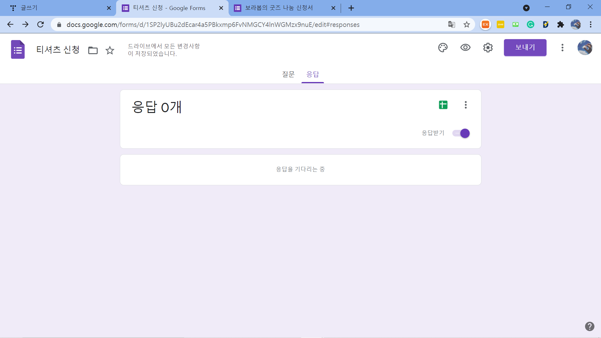 11. ‘응답’ 탭을 누르면 제출된 설문을 확인할 수 있습니다.
