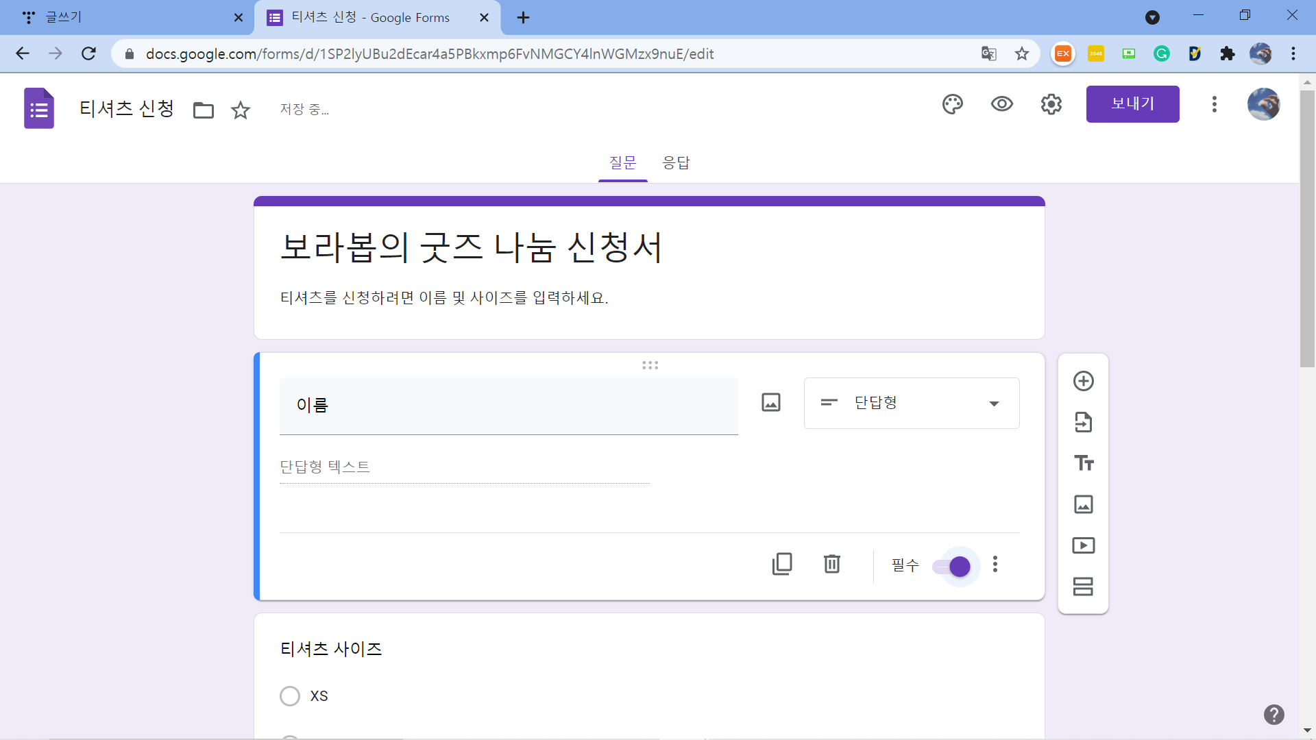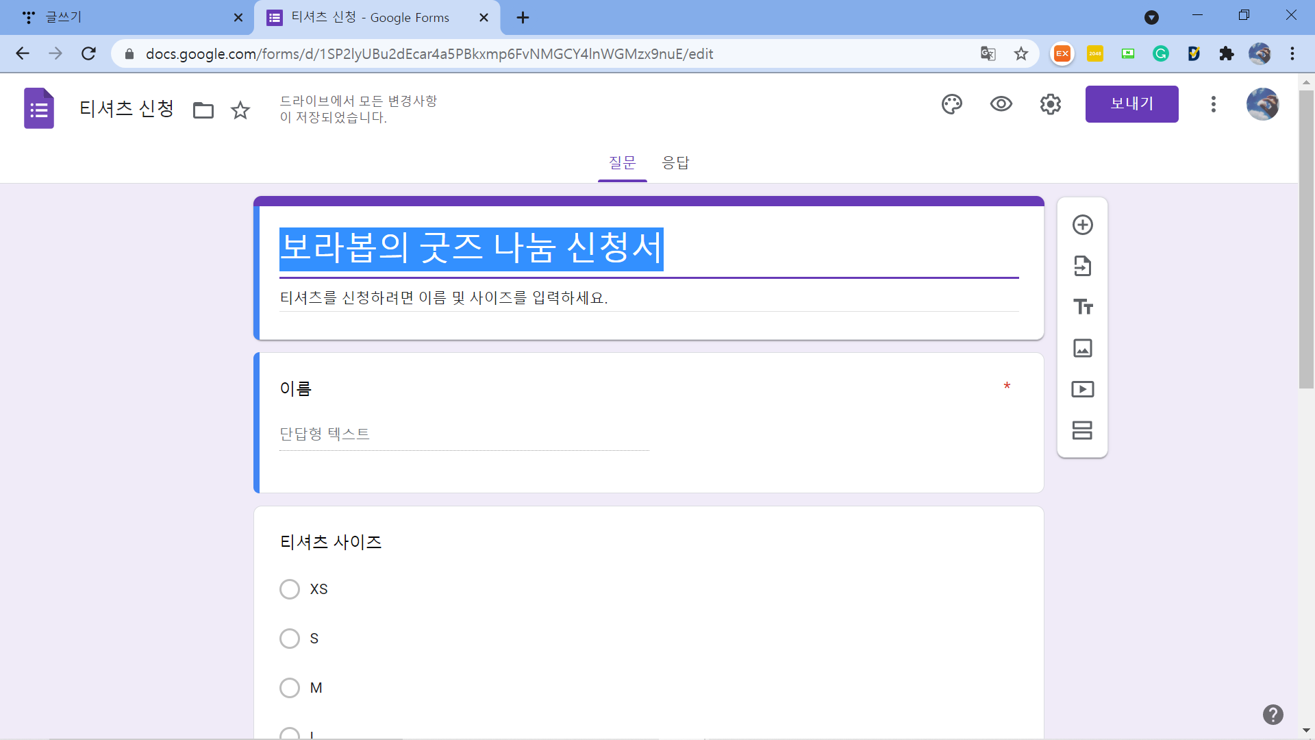 예시로 제 블로그 굿즈 신청서 양식을 만들어 보겠습니다.