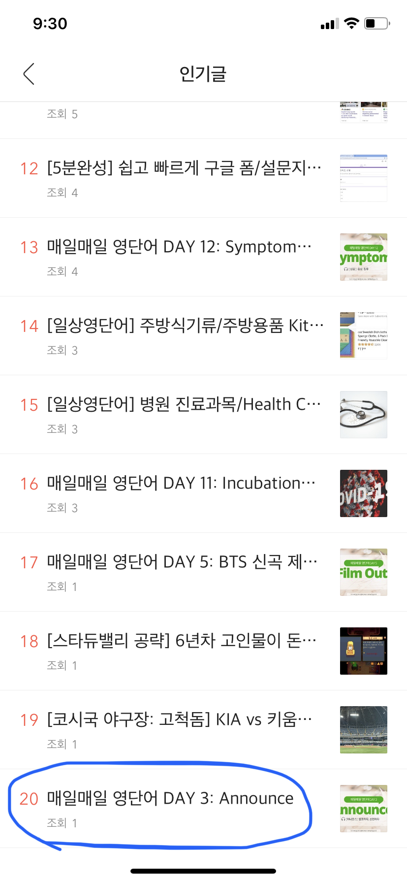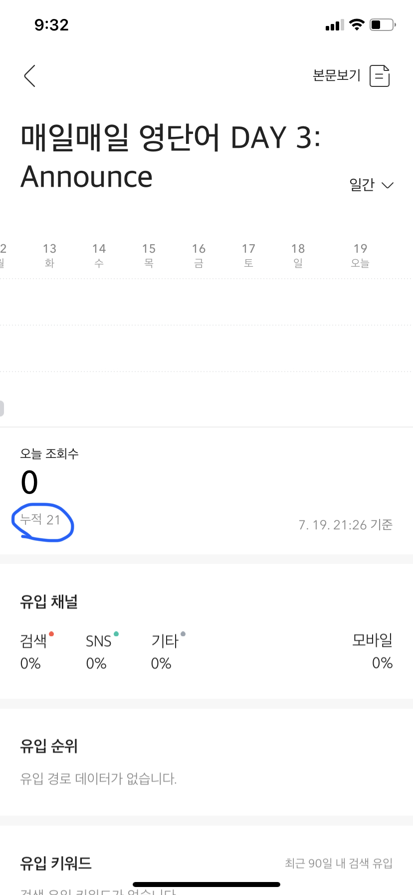 (그 전에는 인기 글 상위권에 머물렀고 제 기억으로는 조회 21회였습니다.)