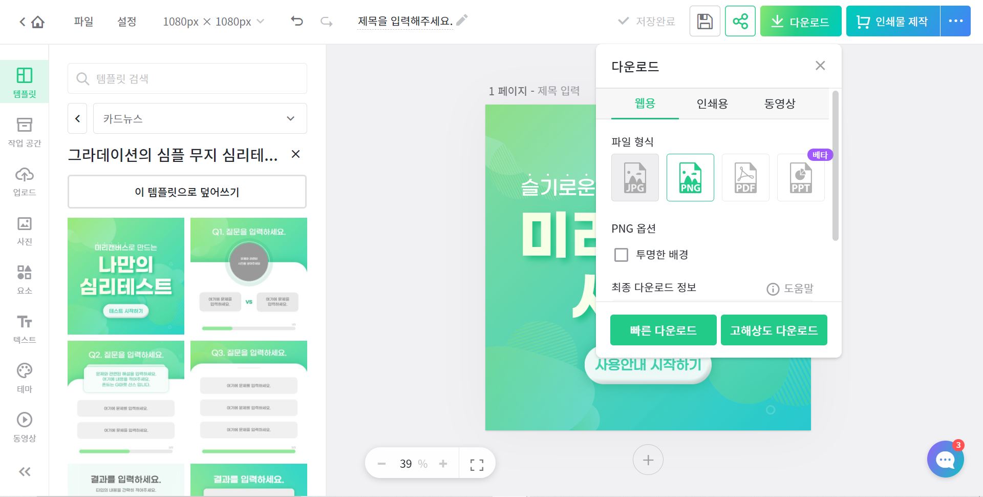 다운로드 버튼을 눌러서 다양한 형식으로 다운로드를 할 수 있습니다. (PDF, JPG, PNG, PPT 등)