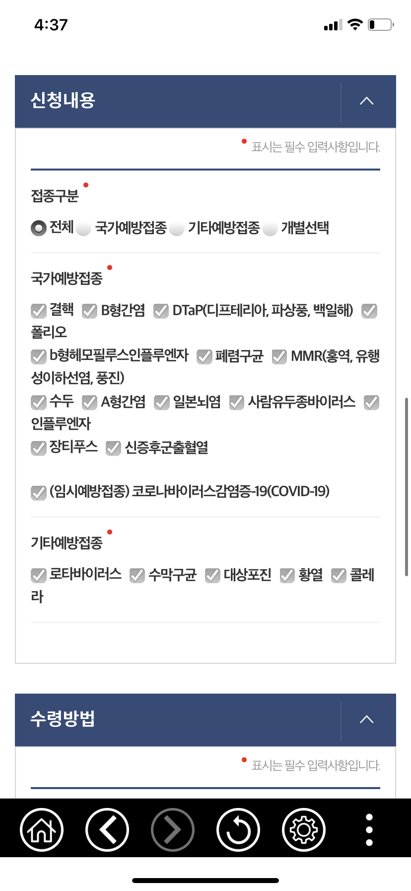 원하시는 접종 목록을 선택하신 뒤, 민원 신청하기 버튼을 누르시면 완료가 됩니다.