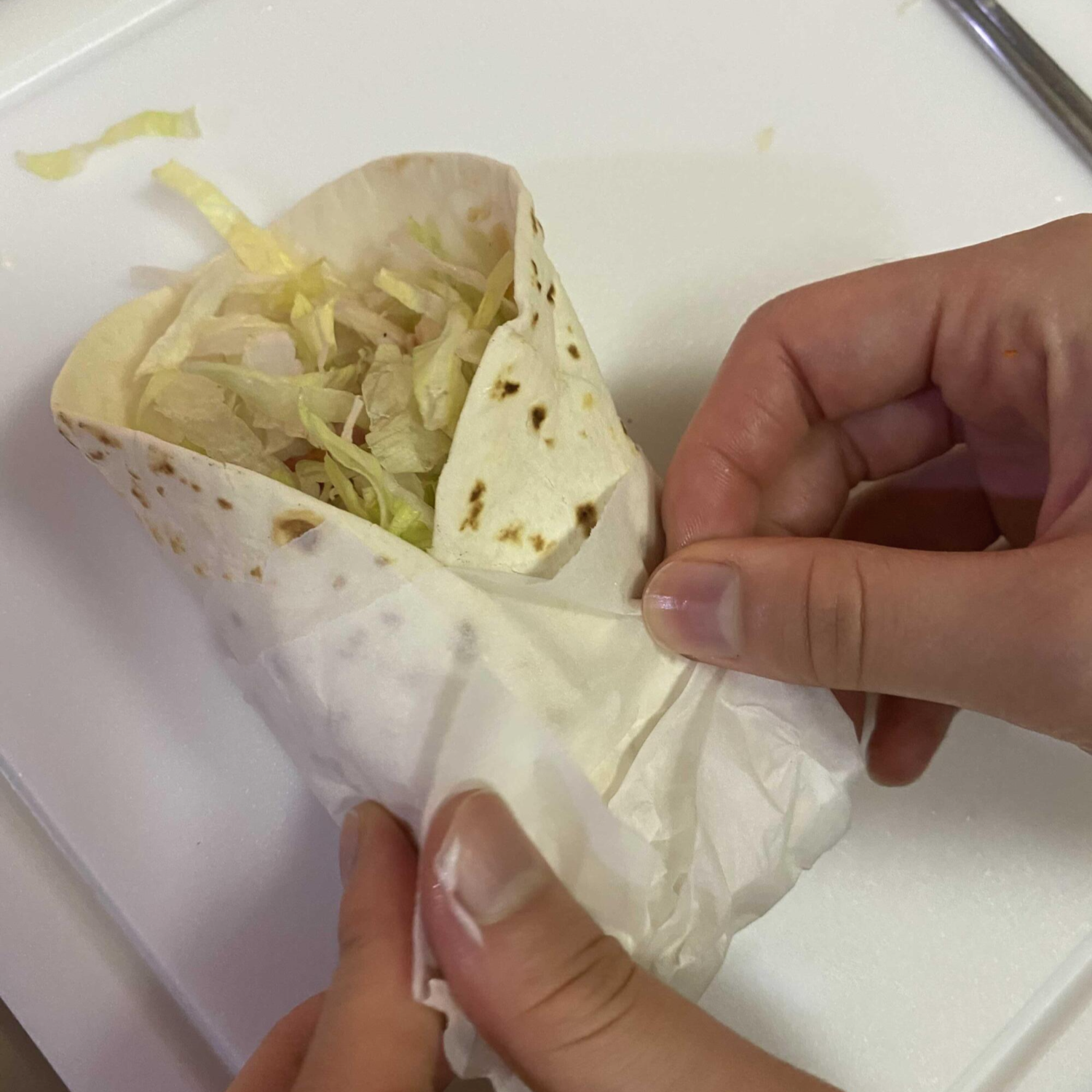 4. 마지막으로 양상추를 올리고 또띠아 아래에 있는 종이호일로 또띠아를 말아줍니다.