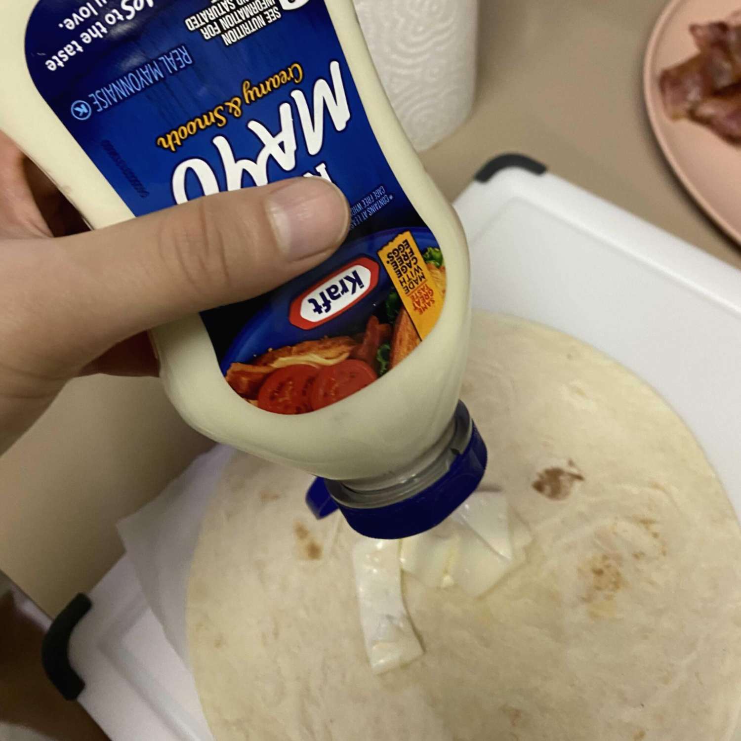 2. 마요네즈를 구운 또띠아 위에 발라줍니다. 머스타드를 발라도 맛있어요! 취향에 따라서 선택하시면 됩니다.