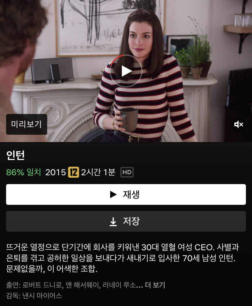 - 은퇴 후 70대 할아버지가 인턴으로 취업하면서 어린 30대 사장님의 비서로 일하는 스토리입니다. 70대 인턴이 젊은 사장과 적응하려고 노력하는 모습이 아주 인상적이었습니다. 보면서 힐링하게 되는 영화입니다. 가족들과 함께 보기에 적당한 것 같아요.